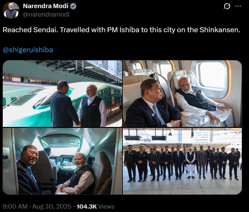 जापानी प्रधानमंत्री शिगेरू इशिबा ने पीएम मोदी के साथ अपनी बुलेट ट्रेन यात्रा की तस्वीरें सोशल मीडिया पर साझा करते हुए लिखा कि प्रधानमंत्री मोदी के साथ सेंडाइ जा रहा हूं. पिछली रात की तरह मैं उनके साथ कार में रहूंगा. यह तस्वीर और संदेश दोनों देशों के शीर्ष नेतृत्व के बीच विश्वास और मित्रता को रेखांकित करते हैं. टोक्यो इलेक्ट्रॉन फैक्टरी का दौरा सेमीकंडक्टर क्षेत्र पर विशेष ध्यान दिया.
