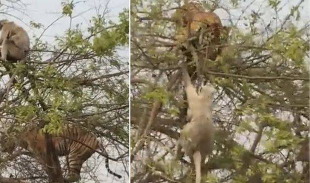 हुआ यूं कि जैसे ही टाइगर, लंगूर के करीब पहुंचता है, तभी लंगूर पेड़ को थोड़ा हिलाता है, जिससे बाघ हरकत आ कर आगे बढ़ने लगता है फिर लंगूर वहां से हटकर पीछे चला जाता है और बाघ वहीं झाड़ियों में लटका रह जाता है फिर बाघ एक दम से सीधे नीचे गिर जाता है।